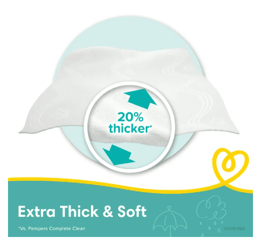 Free of alcohol; perfume; parabens; phenoxyethanol; and dyes 20% thicker for a soft and comfortable clean vs. Pampers Complete Clean